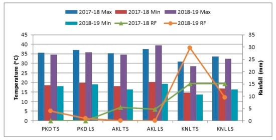 Experiments were laid out following a rectangular lattice design in which each genotype was planted in a two-row plot of 2.0 m length, maintaining a row spacing of 23 cm. Seed rate was kept at 100 kg ha−1. Recommended package of practices for the agro-climatic zone was followed to raise the crop. The crop was protected from disease (rust) by spraying tilt (propiconazole), and weeds were removed manually. Standard agronomic practices were followed to raise healthy wheat crops, except for the number of irrigations. The meteorological data were generated by an automatic weather station (Watch Dog 2900). The daily mean maximum and mean minimum temperatures were recorded for the characterization of environments. Mean minimum and maximum temperatures before and after heading were calculated by taking into consideration the minimum number of days to heading (DH) and the maximum number of days to maturity (DM). Details of temperature and rainfall data of the post-heading period during crop season at three locations are presented in (Figure 1).