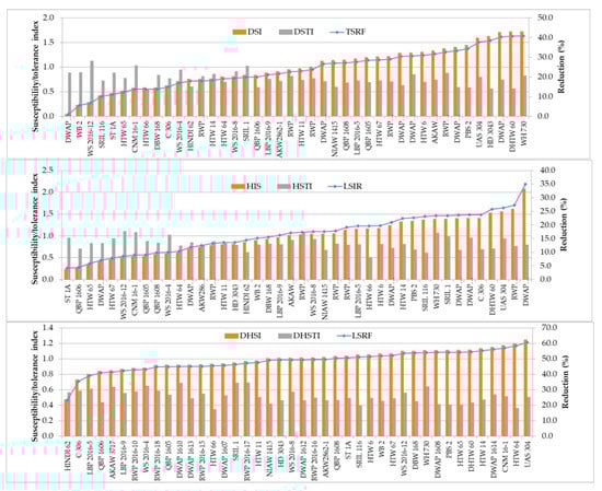 Susceptibility index, tolerance index and reduction in grain yield under drought (TSRF-DR), heat (LSIR-HT) and combined stress (LSRF-DHT). DSI ranged from 0.04 to 1.73, HSI from 0.25 to 2.09, and DHSI from 0.48 to 1.25.