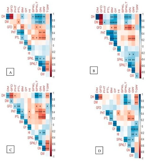 Correlation coefficients among various traits under TSIR-NS (A), TSRF-DR (B), LSIR-HT (C) and LSRF-DHT (D). Grain yield (GY) had a significant positive correlation with biomass (BM) under all conditions and BM had a significant positive correlation with plant height (PHT) and productive tillers (PTL). DH: Days to heading, DM: Days to maturity, GFD: Grain-filling duration, PHT: plant height, PTL: productive tillers, BM: biomass, GY: grain yield, HI: harvest index, SPKL: spike length, SPKLT: spikelets/spike, GN: grain number/spike, GW: grain weight/spike, TGW: 1000-grain weight. *, **, *** Significant at p < 0.05, 0.01, 0.001 respectively; empty cells represent non-significant correlation.