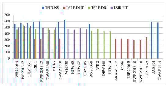 Top ten high-yielding genotypes under TSIR-NS, LSRF-DHT, TSRF-DR and LSIR-HT. WS 2016-4 was high-yielding under all conditions, WS 2016-12, CNM 16-1, SRIL 1, RWP 2016-17 under three conditions, and DWAP 1608, ST1A, and DWAP 1610 under two conditions.