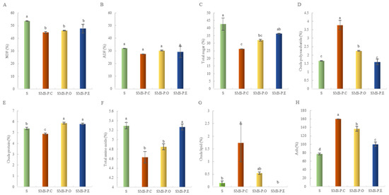 No significant differences were found on the contents of ADF under different SMS treatments (Figure 1B). The change tendency in contents of CPA, CL, and ash were similar, in that they were the highest in SMS-P.C, followed by SMS-P.O and SMS-P.E. The contents of CPA and CL were not significant difference between SMS-P.E and S (Figure 1D,G,H). The contents of NDF, TS, and AA were similar, in that they were the lowest in SMS-P.C, followed by SMS-P.O and SMS-P.E. The content of TS and AA were not significant difference between SMS-P.E and S (Figure 1A,C,F). The content of crude protein in SMS-P.O and SMS-P.E were higher than that in S and SMS-P.C (Figure 1E).