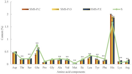 Figure 2. Changes in amino acid components in substrate (S) and spent mushroom substrates (SMS). SMS-P.C, SMS-P.O, and SMS-P.E indicated SMS from P. eryngii, P. ostreatus, and P. citrinopileatus. Amino acid components included alanine (Ala), arginine (Arg), aspartic acid (Asp), tyrosine (Tyr), glutamic acid (Glu), glycine (Gly), histidine (His), isoleucine (Ile), leucine (Leu), lysine (Lys), methionine (Met), phenylalanine (Phe), proline (Pro), serine (Ser), threonine (Thr), and valine (Val). ** indicated significance of amino acid among SMS at 0.05 level.