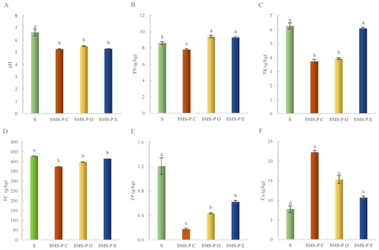 Figure 3. The pH (A), TN (B), TK (C), TC (D), TP (E), and Ca (F) in substrate and spent mushroom substrates. Notes: SMS-P.C, SMS-P.O, and SMS-P.E indicated SMS from P. eryngii, P. ostreatus, and P. citrinopileatus. TN, TK, TC, TP were abbreviations of total nitrogen, total potassium, total carbon and total phosphorus. Substrate and spent mushroom substrates were abbreviated by S and SMS. The diverse letters indicated significant difference at 0.05 level.