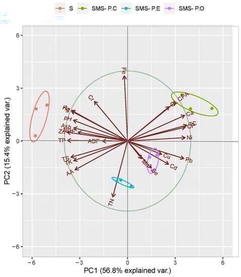 The first component differentiated S and SMS-P.E from SMS-P.C and SMS-P.O. The second component differentiated S and SMS-P.C from SMS-P.O and SMS-P.E. S was characterized by TC, TS, TP, and Zn. SMS-P.C was characterized by CP, Ash, Cu, Ni, and Ca. SMS-P.O was characterized by CL. SMS-P.E was characterized by TK, Mn, and AA (Figure 4).