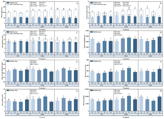 Agronomic characteristics of potatoes in different periods, plant height (A), LAI (B) and stem diameter (C) overground. Underground part of roots, total root length (D), root average diameter (E), root surf area (F), root volume (G) and root tip (H). Solid blocks represent the mean value of the budding stage and hollow blocks for the tuber maturation stage. Capital letter before F-value: B, budding stage; M, tuber maturation stage; N, nitrogen levels; T, base/topdressing ratio, the values refer to the F-value of ANOVA. Bars indicate standard errors (n = 3), and different lowercase letters indicate significant differences between treatments (p < 0.05). ns, not significant, * p < 0.05, ** p < 0.01.