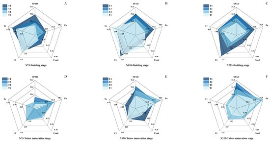 Comparison of photosynthetic characters of potato leaf at budding stage (A–C) and tuber maturation stage (D–F). Each angle of the pentagon showed different traits, SPAD, Pn-net photosynthetic rate (μmol CO2 m−2 s−1), Cond-stomatal conductance (mol H2O m−2 s−1), Ci-Intercellular CO2 concentration (μmol CO2 mol−1), Tr,-transpiration rate (mmol H2O m−2 s−1). Base/topdressing ratio of T1, T2, T3, and T4 is 2:8, 5:5, 8:2 and 10:0, respectively.