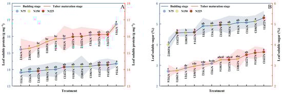 Leaf soluble protein (A) and leaf soluble sugar (B) content, broken lines show means of the budding stage (blue) and tuber maturation stage (red), shade along the broken line indicate standard errors (n = 3), different lowercase letters indicate significant differences between treatments (p < 0.05). Balls of N75 in blue, N150 in yellow, and N225 in red are sorted by size.