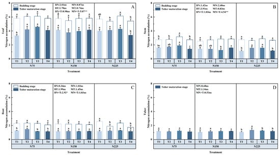 The nitrogen uptake and utilization characteristics of potatoes differed at different breeding periods, and as potatoes grew the nitrogen content of the plant decreased to synthesize other metabolites. Total plant nitrogen accumulation in N75, N150, and N225 treatments was 1.33 g, 1.45 g, 1.41 g at the budding stage, 13.81 g, 16.38 g, and 13.82 g at tuber maturity, and the highest in the N150 treatment. N225T2 had a significantly (p < 0.05) higher N content than the other treatments, while T1 had the lowest percentage, showing a trend of T3 > T4 > T2 > T1 overall. Although supplemental N fertilization had little effect on the average N content in the tubers (Figure 4D), tubers’ dry matter accounted for 68.65–82.10% of the plant dry matter content at the tuber maturity stage (Table 2).