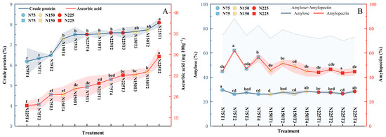 Tuber crude protein (A blue) and ascorbic acid (A red) content, tuber amylose (B blue) and amylopectin (B red) content, amylose added to amylopectin Broken lines show mean value, shade along the broken line indicates standard errors (n = 3), different lowercase letters. The results of the study show that the mean value of N75 in blue was higher than that of N75 in blue. Balls of N75 in blue, N150 in yellow, and N225 in red are sorted by size in (A), but by N management in (B).