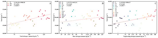 Fitting analysis of different nitrogen application rates and yields, total N amount (A), base N amount (B), topdressing N amount (C). R2—linear correlation coefficient, r—Spearman rank correlation coefficient, ** p < 0.01.