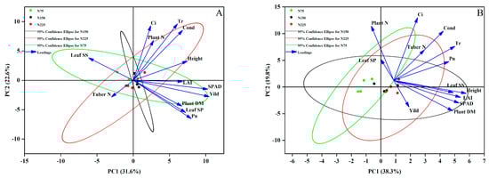 PCA analysis of traits at the budding stage (A) and tuber maturation stage (B). Leaf SS-leaf soluble sugar, leaf SP-leaf soluble protein, plant DM-plant dry matter, plant N-N in whole plant except tuber, tuber N-N in the tuber, Pn-net photosynthetic rate, Ci-intercellular CO2 concentration, Cond-stomatal conductance, Tr-transpiration rate, LAI-leaf area index.