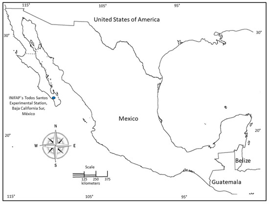 Two experiments were conducted during two consecutive years (2020 and 2021) at the National Institute for Forestry, Agriculture and Livestock Research (INIFAP), Todos Santos Experimental Station, Baja California Sur, México (at 110°09′ latitude N and 23°25′ longitude W, and at 150 m above sea level (Figure 1)). The climate in this area is arid and hot, with a mean rainfall and temperature of 168.6 mm and 24.6 °C, with 60% of annual rainfall occurring during the summer season [28,29]. During the period of time in which the experiments were conducted, the temperature ranged from 10.55 to 32.34 °C, with a relative humidity between 51.89 and 67.99% (Table 1).