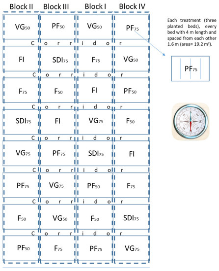 A completely randomized block design testing eight irrigation treatments with four replications (Figure 2) was implemented, full irrigation (FI, ETc = 100%), sustained deficit irrigation (SDI75, ETc = 75% during vegetative growth (VG), flowering (F), and pod-filling (PF), and six combinations of regulated deficit irrigation (RDI) varying across phenology, VG50 (ETc = 50%), VG75 (ETc = 75%), F50 (ETc = 50%), F75 (ETc = 75%), PF50 (ETc = 50), and PF75 (ETc = 75), were established each year (Table 3). The experimental treatment units consisted of three 4 m long planting beds spaced 1.6 m apart (an area of 19.2 m2). A one-meter-wide corridor separated contiguous treatments inside each block. For the duration of each stage of development, we calculated the growing degree days (GDD) through the formula GDD = ((Tmax + Tmin)/2) − Tb, where Tmax and Tmin are the daily maxima and minimum temperature, and Tb is the base temperature (5 °C) [31].