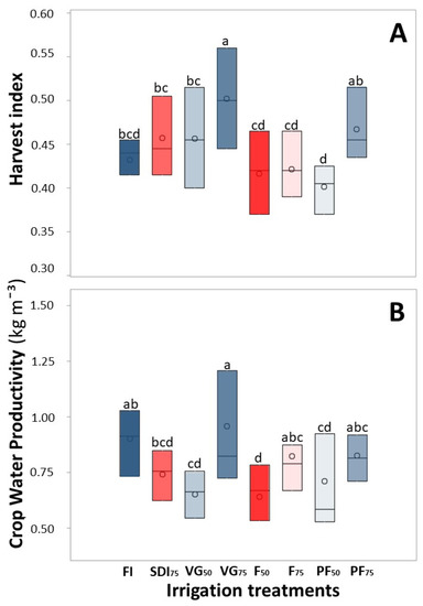 (A) Harvest index and (B) crop water productivity of chickpeas under different irrigation treatments in Todos Santos, Baja California Sur, Mexico. Vegetative growth (VG), flowering (F), and pod-filling (PF) stages. RDI = regulated deficit irrigation. FI = full irrigation application of 100% ETc during VG, F, and PF. SDI75 = sustained deficit irrigation applying 75% of ETc during VG, F, and PF. VG50 = RDI applying irrigation equivalent to 50% of ETc in VG. VG75 = RDI applying irrigation equivalent to 75% of ETc in VG. F50 = RDI applying irrigation equivalent to 50% of ETc in F. F75 = RDI applying irrigation equivalent to 75% of ETc in F. PF50 = RDI applying irrigation equivalent to 50% of ETc in PF. PF75 = RDI applying irrigation equivalent to 50% of ETc in PF. abcd Different letter among treatments indicates statistical significance (p ≤ 0.05, LSD). More intense blue in box plot indicates higher total irrigation volume, and more intense red in box plot indicates lower total irrigation volume.
