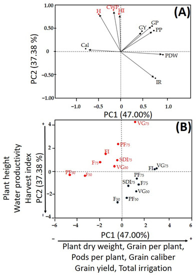 (A) Variable distribution and (B) irrigation treatments distribution across the two principal components. Vegetative growth (VG), flowering (F), and pod-filling (PF) stages. RDI = regulated deficit irrigation. FI = full irrigation application of 100% ETc during VG, F, and PF. SDI75 = sustained deficit irrigation applying 75% of ETc during VG, F, and PF. VG50 = RDI applying irrigation equivalent to 50% of ETc in VG. VG75 = RDI applying irrigation equivalent to 75% of ETc in VG. F50 = RDI applying irrigation equivalent to 50% of ETc in F. F75 = RDI applying irrigation equivalent to 75% of ETc in F. PF50 = RDI applying irrigation equivalent to 50% of ETc in PF. PF75 = RDI applying irrigation equivalent to 50% of ETc in PF.