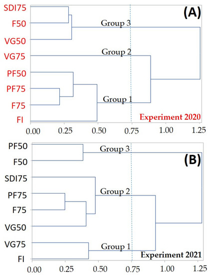 Treatment cluster analysis in (A) experiment 2020 and (B) experiment 2021. Vegetative growth (VG), flowering (F), and pod-filling (PF) stages. RDI = regulated deficit irrigation. FI = full irrigation application of 100% ETc during VG, F and PF. SDI75 = sustained deficit irrigation applying 75% of ETc during VG, F, and PF. VG50 = RDI applying irrigation equivalent to 50% of ETc in VG. VG75 = RDI applying irrigation equivalent to 75% of ETc in VG. F50 = RDI applying irrigation equivalent to 50% of ETc in F. F75 = RDI applying irrigation equivalent to 75% of ETc in F. PF50 = RDI applying irrigation equivalent to 50% of ETc in PF. PF75 = RDI applying irrigation equivalent to 50% of ETc in PF.