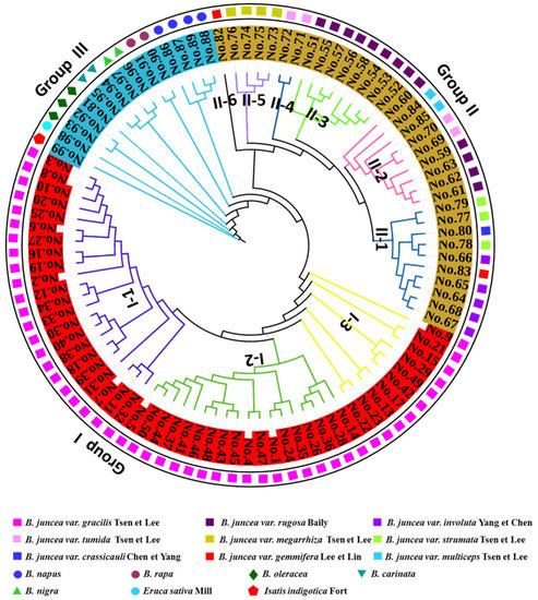 Genetic diversity analysis is the basic work for the effective management and utilization of plant genetic resources. B. juncea is an important crop, which includes oilseed and vegetable types [2,3,4]. In the present investigation, a panel of 99 accessions of the Brassicaceae family, including 84 mustard from 14 provinces in China and 15 other Brassicaceae accessions, was analyzed for their genetic diversity via nuclear and mitochondrial molecular markers. These 84 mustard accessions included 50 oilseed and 34 vegetable types of four subspecies in B. juncea [6]. The vegetable type included the eight most popular varieties of 16 subspecies reported in China [5,7]. The UPGMA cluster analysis based on the 232 polymorphic fragments produced by the 18 SSR, 20 SRAP, and 7 ISJ primers divided all accessions into three major clusters. Cluster I included 50 oilseed mustard, cluster II included 34 vegetable mustard, and cluster III contained 15 other Brassicaceae accessions. Cluster I and cluster II could be further divided into several subclusters. Generally, oilseed mustard accessions were clustered according to their resource, but selection has a certain effect, and vegetable mustard accessions were clustered according to their variety type. The results of principal component analysis and population structure analysis were in accordance with the cluster analysis. All the 84 mustard accessions have cam cytoplasm according to the improved multiplex PCR analysis, and have three mitotypes (MTs1-3) detected by the InDel and SNP markers associated with variations in the mitochondrial genome [8,53]. Our results indicated that there are considerable variations in the tested mustard accessions both at nuclear and cytoplasmic levels, and oilseed- and vegetable-mustards can be used for broadening the genetic background for each other.