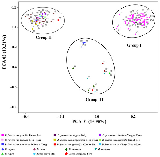 Principal component analysis (PCA) was carried out from the similarity matrix calculated from 232 SSR, SRAP, and ISJ molecular markers data. As a result, the first two principal components explained 16.95% and 10.31% of the total variations, respectively. The PCA result was generally similar to the cluster analysis (Figure 2). The PCA results divided the 99 accessions into three groups. Group I included 50 oilseed mustard accessions, group II 34 the vegetable-type mustards, and group III the 15 other Brassicaceae accessions.