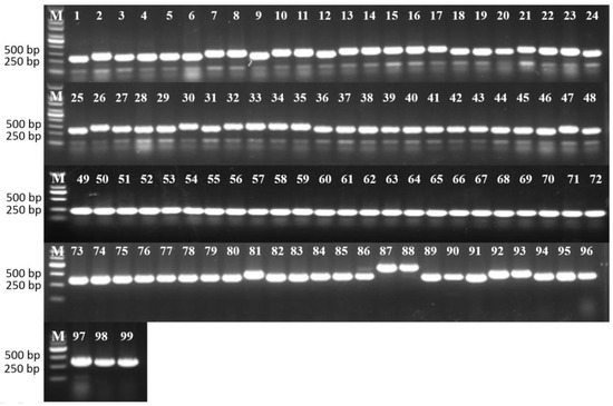 PCR amplification of the tested accessions using the Indel marker. M, marker; the accession numbers are shown in Table S1.