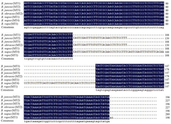 Sequence alignment of PCR products yielded by the Indel marker. B. juncea (MT1), Nos. 4 and 9; B. juncea (MT2), Nos. 13, 14, 15, and 16; B. juncea (MT3), Nos. 3, 12, 57, and 58; B. oleracea (MT2), No. 81; B. napus (MT1), Nos. 86, 89, and 90; B. napus (MT4), Nos. 87 and 88; B. rapa (MT1), No. 91. Blue areas represent the same base sequence.