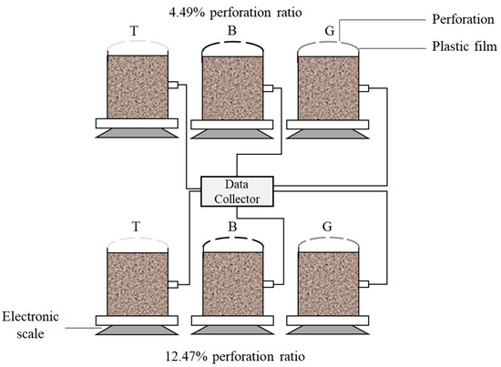 Soil column experiments were used to determine soil evaporation and energy distribution under plastic film mulching with six treatments that included two substantial variables—film colour and film perforation ratio. The plastic films were transparent (T), black (B), or silver-grey (G) with two perforation ratios: 4.49% (1) or 12.47% (2). The plastic films were made of polyethylene (PE). The space between the plastic film and soil surface affects evaporation and energy distribution [30]; increasing it reduces the energy loss by heat conduction and convection. This effect was not tested in the current study, and a 30 mm space was maintained for all six treatments.