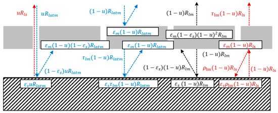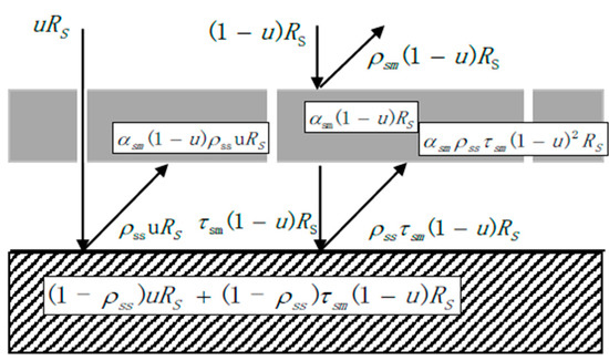where and are the shortwave and longwave radiation, respectively, at the soil surface. A schematic diagram of the shortwave radiation transmission, reflection, and absorption at the plastic and soil surface boundaries is presented in Figure 3. Based on Figure 3, the shortwave radiation at the soil surface can be expressed as: