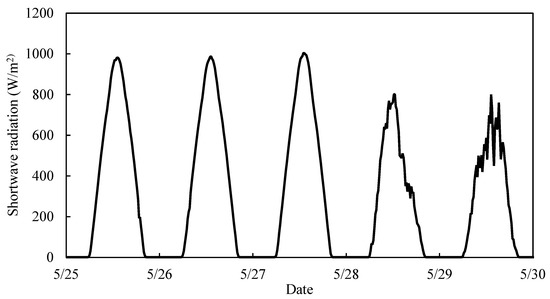 The measured shortwave radiation during the experimental period is depicted in Figure 5. It consisted of a single daily peak of 981.9, 988.1, 1004.4 801.9, and 800.6 W m−2 at 13:45 on May 25, 26, 27, 28, and 29, respectively, and decreased to 0.6 W m−2 from 20:45 h to 5:45.