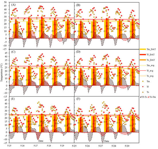 Variations in plastic film temperature (), soil surface temperature (), temperature below the soil surface (), daily average temperature for the plastic film (), soil surface () and 10 cm below the soil surface (), and the overall average temperatures for film, soil surface, and soil at 10 cm depth between 25 May and 30 May (_avg, _avg, _avg, respectively) for the six treatments: (A) T1; (B) T2; (C) B1; (D) B2; (E) G1; (F) G2.