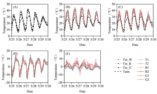 Comparisons of (A) plastic film temperature (); (B) temperature below the soil surface (); (C) soil surface temperature (); (D) the difference between and (); (E) the difference between and () for the six treatments.