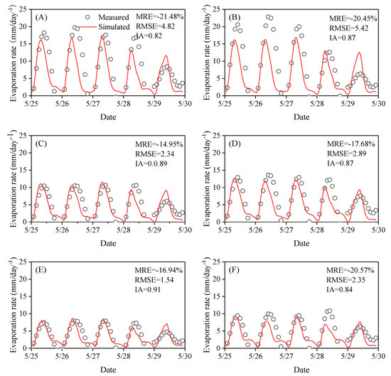 Comparison of simulated and measured evaporation rates for the six treatments: (A) T1; (B) T2; (C) B1; (D) B2; (E) G1; (F) G2.