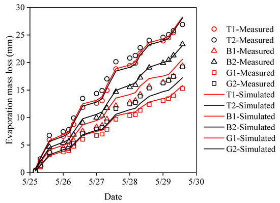 Comparison of simulated and measured evaporation mass losses for the six treatments.