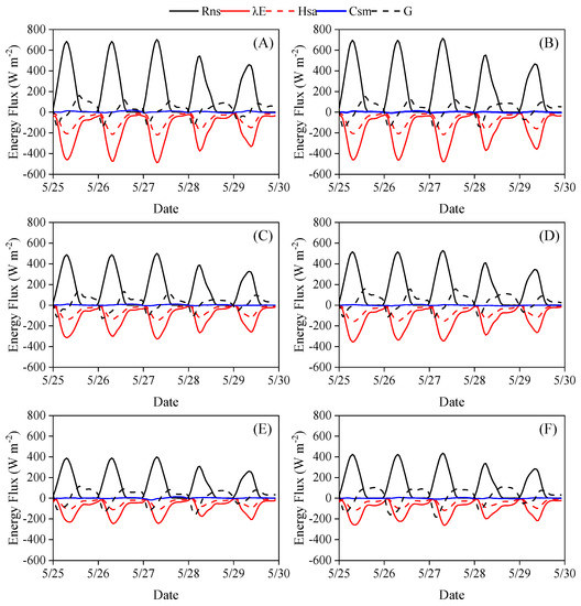 Simulated energy balance for the six treatments: (A) T1; (B) T2; (C) B1; (D) B2; (E) G1; (F) G2. Included are the net radiation at the soil surface (); the latent heat flux between the soil surface and atmosphere (); the air sensible heat flux between the soil surface and the atmosphere (); the heat conduction between the plastic film and the soil surface (); and the heat flux downward through the soil surface ().