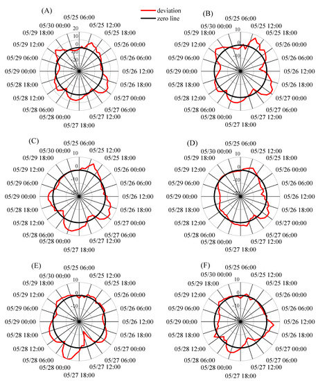 As shown in Figure 11, the heat conduction between the soil surface and the plastic film, , is lower than , , , and G, and as a consequence, is disregarded in agroecosystem models [16,36], and even for mulched fields [8,38]. We therefore further quantified the impact of on and determined whether this component is essential in the energy balance for calculations beyond the mechanistic process evaluation. Figure 12 demonstrates the deviation in the latent heat flux () when () is included in the SMAS model. The range of the radar chart is uniform for T1 and T2, and more significant for the B1, B2, G1, and G2 treatments due to the larger under the transparent plastic film. Where the red curve extends beyond the bold black circle, increases with the inclusion of ; when the red curve shows the opposite pattern, decreases upon exclusion of . The difference between maximum and minimum is 17.24, 13.89, 10.76, 9.61, 21.99, and 11.80 W m−2 for T1, T2, B1, B2, G1, and G2, respectively. The fluctuations of are small compared to the value of the latent heat flux itself, and can therefore be excluded from the calculation of daily evaporation mass loss. In contrast, should be considered when the SMAS model is used to follow the evaporation dynamics, in particular during the night when small changes in can induce a substantial relative difference. The absolute relative error between during the night hours when was taken into account compared to when it was excluded reached 11.9%, 8.1%, 29.8%, 7.4%, 7.9%, and 4.3% for T1, T2, B1, B2, G1, and G2, respectively. When the daily evaporation, but not its dynamics, is of concern, ignoring simplifies the energy-partition calculation. In this case, does not need to be measured. The lower values obtained in the current experiments compared with those in Ham and Kluitenberg (1994) may be related to the smaller difference between and in our study [33]. Beyond the embedded differences between column experiments and field studies, emerging inter alia due to scale and the soil disturbance of the former that affects its hydraulic properties [47,48,49,50], Ham and Kluitenberg’s (1994) study was performed with intact films (with no perforations) [33]. These may explain the inconsistency between the results obtained by Ham and Kluitenberg (1994) and those of our study [33].