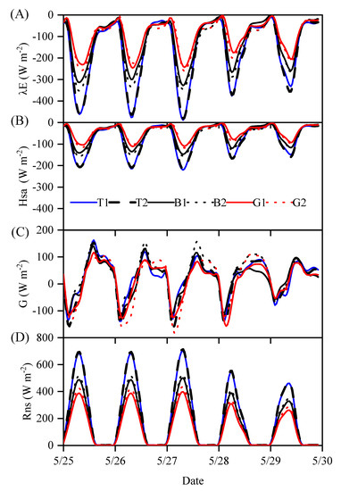 Comparisons of the different components: (A) the latent heat flux between the soil surface and atmosphere (); (B) the air sensible heat flux between the soil surface and the atmosphere (); (C) the heat flux downward through the soil surface (); (D) the net radiation at the soil surface ().