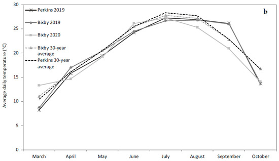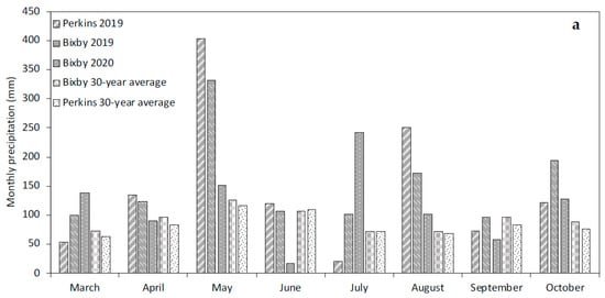 Field trials were conducted at the Mingo Valley Research Station (35°57′52.3″ N, 95°51′38.6″ W) near Bixby, OK, in 2019 and 2020 and the Cimarron Valley Research Station (35°59′09.1″ N, 97°02′47.1″ W) near Perkins, OK, in 2019. The soils at the Bixby and Perkins locations were both Mollisols. The soil series in Bixby was a mix of Wynona silty clay (fine-silty, mixed, active, thermic Cumulic Epiaquolls) and a Mason silt loam (fine-silty, mixed, active, thermic Pachic Argiudolls). The Perkins soil consisted of a Teller fine sandy loam (fine-loamy, mixed, active, thermic Udic Argiustolls). Rainfall in the 2019 growing season between May and October amounted to 808 mm and 865 mm in Bixby and Perkins, respectively (Figure 1a). In 2020, Bixby received 925 mm of rainfall and was the sole established location due to planting failure at Perkins resulting from early-season flood conditions (Figure 1a). Temperature patterns were similar across all site years (Figure 1b).