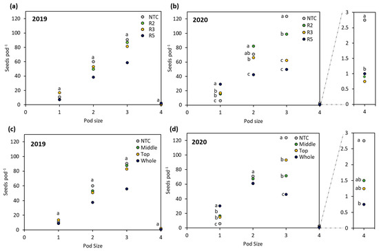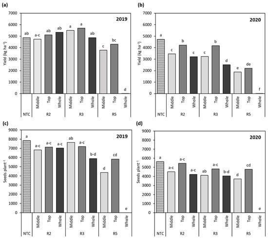 (a) Comparison of soybean yield as affected by cumulative stage and location effects in 2019 and (b) in 2020. (c) Comparison of numbers of seeds per plant as affected by cumulative stage and location effects in 2019 and (d) in 2020. Different letters indicate significant difference. NTC—non-treated control, R2—full flower, R3—beginning of pod development, R5—beginning of seed development.