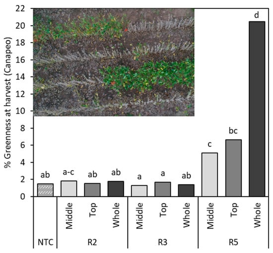 Canapeo readings prior to harvest indicating percentage of remaining vegetative tissue with green stem syndrome. Drone image depicts the green stem that developed in the R5 top and R5 whole treatments compared to the proximal non-treated control areas. Different letters indicate significant differences. NTC—non-treated control, R2—full flower, R3—beginning of pod development, R5—beginning of seed development.