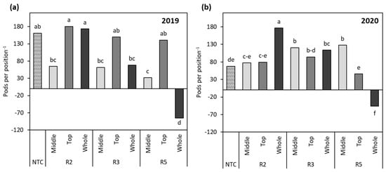 Effects of the interaction between stage, location, and position on the number of pods contributing to yield in 2019 and 2020. Different letters indicate significant differences amongst treatments. NTC—non-treated control, R2—full flower, R3—beginning of pod development, R5—beginning of seed development.