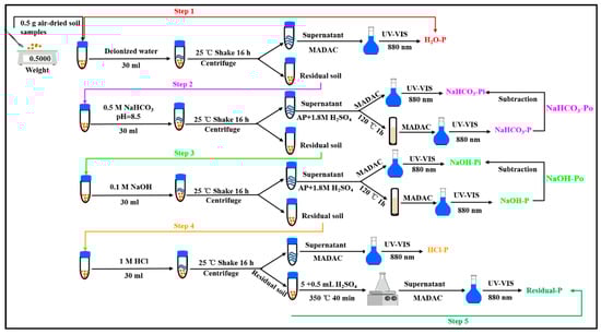 Soil samples were collected at the same time as the plant samples, with the hand-shaking method adopted to obtain the non-rhizosphere and rhizosphere soil [39]. The soil samples were dried in the shade and passed through 1 mm and 0.15 mm nylon sieves to determine available P and P fractions, respectively. Soil available P was extracted with 0.5 mol L−1 NaHCO3, with the filtered liquid measured by an automatic continuous flow analyzer (San++, Skalar, Breda, Netherlands). Soil P fractions were determined following the modified Hedley continuous extraction method [26,27] (Figure 1), with the seven P fractions determined by molybdenum-antimony resistance colorimetry and UV-visible spectrophotometer (UV-1800, Shimadzu, Kyoto, Japan).