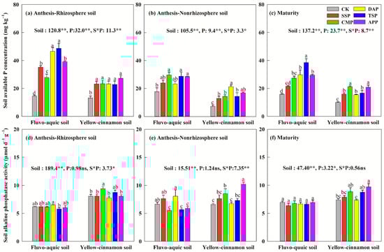 In the calcareous soil, DAP had the highest alkaline phosphatase activity in rhizosphere and non-rhizosphere soil at wheat anthesis. Still, no significant differences between P fertilizer treatments occurred at maturity (Figure 3d–f). CMP had the highest alkaline phosphatase activity in rhizosphere soil in non-calcareous soil at wheat anthesis, similar to TSP. APP had the greatest increase in alkaline phosphatase activity in non-rhizosphere soil between anthesis and maturity but did not significantly differ from TSP and CMP.