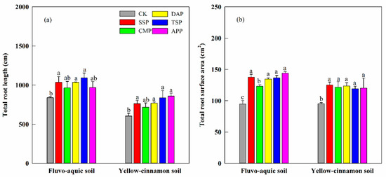 Total root length (a) and total root surface area (b) as affected by P fertilizer type in calcareous and non-calcareous soil. Data are presented as means of three replications with standard errors. Different lowercase letters indicate significant mean differences between P fertilizer types in the same soil (LSD, p < 0.05).