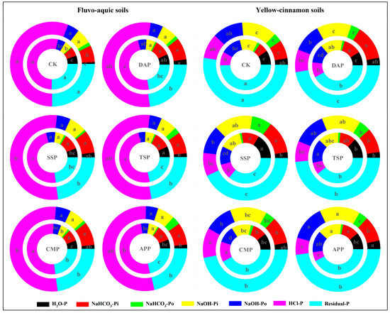 In the calcareous soil, TSP had a significantly higher concentration and proportion of H2O-P in rhizosphere soil than the other P fertilizer treatments. In contrast, NaHCO3-Pi and NaOH-Pi did not significantly differ between TSP, SSP, DAP, and APP (Figure 5a and Figure 6). CMP had significantly lower concentrations and proportions of H2O-P (20.1% and 14.3%), NaHCO3-Pi (31.0% and 25.9%), and NaOH-Pi (20.1% and 14.2%), but a higher proportion of HCl-P (8.0%) than the other P fertilizer treatment. No significant differences in P fractions concentration and proportion occurred in non-rhizosphere soil under the different P fertilizer types. In the non-calcareous soil, SSP had the highest concentration of H2O-P, NaHCO3-Pi, NaHCO3-Po, and NaOH-Pi in rhizosphere and non-rhizosphere soil, while the concentrations of NaHCO3-Pi and NaOH-Pi in non-rhizosphere soil did not significantly differ between DAP and APP (Figure 5b). Moreover, CMP significantly increased the concentration and proportion of HCl-P in rhizosphere soil (64.1% and 35.9%) and non-rhizosphere soil (62.1% and 32.4%) (Figure 5b and Figure 6). SSP had a significantly higher proportion of residual-P in rhizosphere soil than the other P fertilizer types, but it was 8.6–22.1% lower than the non-rhizosphere soil.