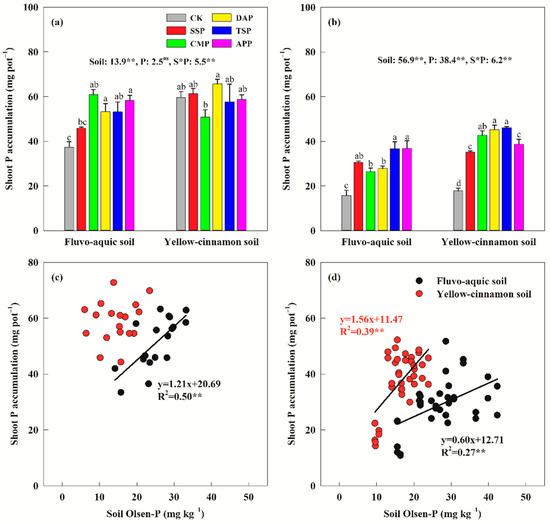 Effect of P fertilizer type on shoot P accumulation at anthesis (a) and maturity (b), and the relationships between soil Olsen-P and shoot P accumulation at anthesis (c) and maturity (d) in calcareous and non-calcareous soil. Data are presented as means of three or six replications with standard errors. Different lowercase letters indicate significant mean differences between P fertilizer types in the same soil (LSD, p < 0.05). Probabilities of F-statistics for P fertilizer types effects are presented at the top of (a,b). (**, ns) significantly difference at p < 0.01 and p > 0.05, respectively.