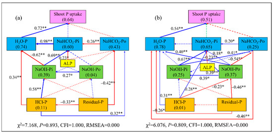 Structural equation model analysis (SEM) examining the direct and indirect effects of soil P fractions on shoot P uptake of winter wheat grown on the calcareous soil (a) and non-calcareous soil (b). ALP, alkaline phosphatase activity. The numbers within the boxes show the explained percentages of the variance by the predictor variables. The blue and red lines/arrows indicate positive and negative relationships. The numbers above the lines denote the standardized path coefficients (* p < 0.05, ** p < 0.01), the thickness of the lines indicates the magnitudes of the causal relationship. Solid and dashed lines indicate significant and insignificant paths, respectively.