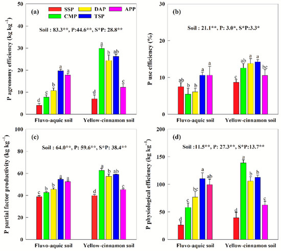 Phosphorus agronomy efficiency (a), P use efficiency (b), P partial factor productivity (c) and P physiological efficiency (d) as affected by P fertilizer type in calcareous and non-calcareous soil. Data are presented as means of three replications with standard errors. Different lowercase letters indicate significant mean differences between P fertilizer types in the same soil (LSD, p < 0.05). Probabilities of F-statistics for P fertilizer-type effects are presented at the top of each figure. (*, **) significantly difference at p < 0.05 and p < 0.01, respectively.