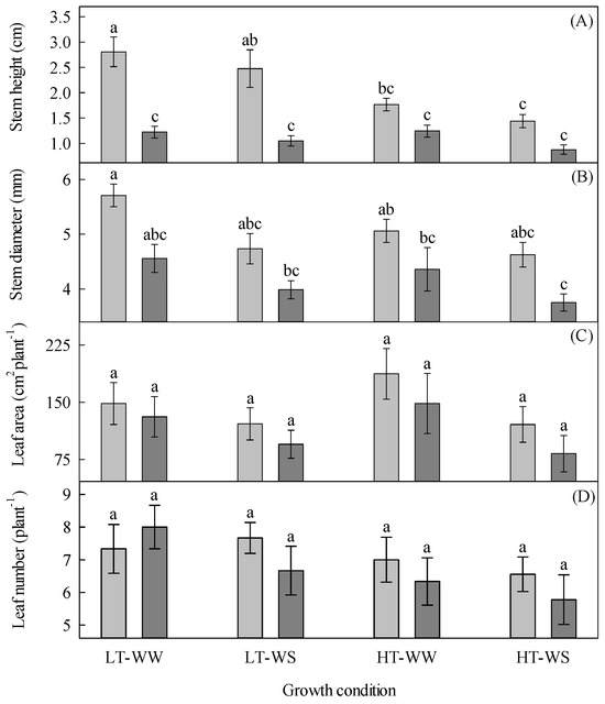 Growth of 33-day-old tomato plants grown under eight experimental conditions including two temperature regimes, two watering regimes, and two abscisic acid concentration applications after 12 days of initial germination and growth in growth chambers with lower temperature, watering to field capacity, and without abscisic acid application. (A) Stem height, (B) stem diameter, (C) leaf area, and (D) leaf number. LT, lower temperature; HT, higher temperature; WW, well-watered; WS, water-stressed; light gray, no abscisic acid; dark gray, abscisic acid. Data are the means ± SE of 236 (stem height and diameter) and 71 (leaf area and number) samples from three experiments. Bars with different letters above them are significantly different, according to Scheffé’s multiple comparison procedure at the 5% confidence level.