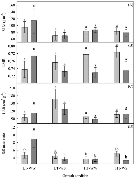 Growth indices of 33-day-old tomato plants grown under eight experimental conditions including two temperature regimes, two watering regimes, and two abscisic acid concentration applications after 12 days of initial germination and growth in growth chambers with lower temperature, watering to field capacity, and without abscisic acid application. (A) Specific leaf mass (SLM), (B) leaf mass ratio (LMR), (C) leaf area ratio (LAR), and (D) shoot to root ratio (S:R). LT, lower temperature; HT, higher temperature; WW, well-watered; WS, water stressed; light gray, no abscisic acid; dark gray, abscisic acid. Data are the means ± SE of 71 samples from three experiments. Bars with different letters above them are significantly different according to Scheffé’s multiple comparison procedure at the 5% confidence level.