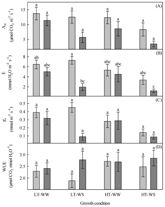 Gas exchange of 33-day-old tomato plants grown under eight experimental conditions including two temperature regimes, two watering regimes, and two abscisic acid concentration applications after 12 days of initial germination and growth in growth chambers with lower temperature, watering to field capacity, and without abscisic acid application. (A) Net CO2 assimilation (AN), (B) transpiration (E), (C) stomatal conductance (gs), and (D) water use efficiency (WUE). LT, lower temperature; HT, higher temperature; WW, well-watered; WS, water stressed; light gray, no abscisic acid; dark gray, abscisic acid. Data are the means ± SE of 88 samples from three experiments. Bars with different letters above them are significantly different according to Scheffé’s multiple comparison procedure at the 5% confidence level.