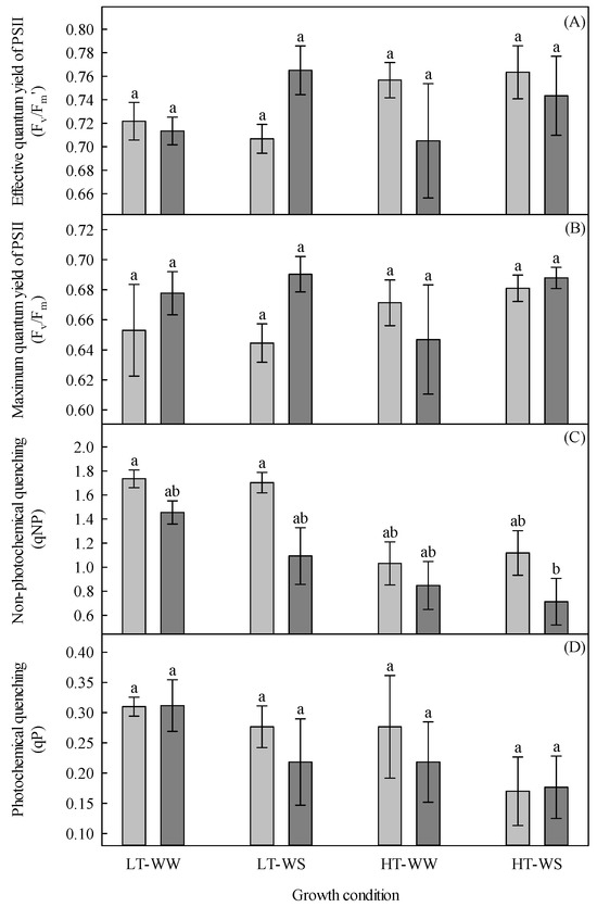 Chlorophyll fluorescence of 33-day-old tomato plants grown under eight experimental conditions including two temperature regimes, two watering regimes, and two abscisic acid concentration applications after 12 days of initial germination and growth in growth chambers with lower temperature, watering to field capacity, and without abscisic acid application. (A) Effective quantum yield of PSII (ΔF/Fm’), (B) maximum quantum yield of PSII (Fv/Fm), (C) non-photochemical quenching (qNP), and (D) photochemical quenching (qP). LT, lower temperature; HT, higher temperature; WW, well-watered; WS, water stressed; light gray, no abscisic acid; dark gray, abscisic acid. Data are the means ± SE of 48 samples from two experiments. Bars with different letters above them are significantly different according to Scheffé’s multiple comparison procedure at the 5% confidence level.