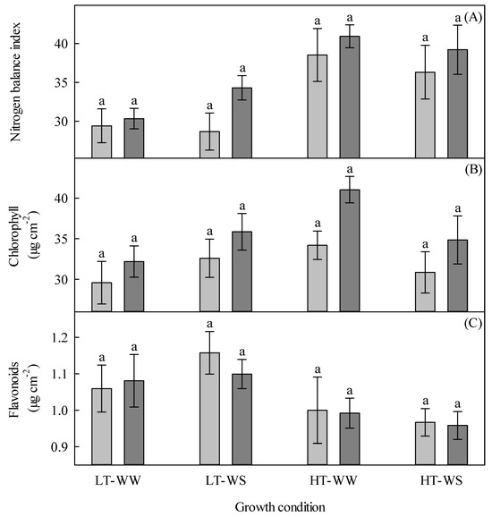 The temperature significantly decreased non-photochemical quenching (qNP) but did not affect the effective or maximum quantum yield (ΔF/Fm’ and Fv/Fm, respectively) or photochemical quenching (qP) (Table 12). Similar results were reported by Gerganova et al. [49], who found that high temperatures significantly reduced qNP in tomato plants. Our results disagree with the past research on temperature and canola [40], as the research has noted an increase in qNP as a mechanism induced by high temperatures in order to protect the photoreaction center of PSII [50]. Photosynthetic pigments, carotenoids, water potential, and leaf moisture were not significantly affected by the temperature (Table 14 and Table 16). As well, the chlorophyll levels, as measured by Dualex Scientific, were not affected by the temperature (Table 18). The nitrogen balance index (NBI) significantly increased with exposure to higher temperatures, which is in agreement with Munyon et al. [51], who reported that the nitrogen balance index increased significantly with increasing the temperature in cereal rye, crimson clover, triticale, and winter wheat. These results suggest that plants grown under higher temperatures may use more carbon to synthesize polyphenols than chlorophyll [52]. On the other hand, our results indicated that the flavonoid levels decreased in plants grown under higher temperatures, which is consistent with [18], who found that high temperatures downregulated the expression of genes required in the flavonoid biosynthesis pathway in Arabidopsis seedlings. High temperatures induce expression of the repressors of anthocyanin biosynthesis and downregulate the expression of the anthocyanin biosynthetic genes [18,53].